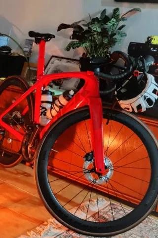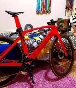 Bicicleta de carretera Trek Madone SL6 en color rojo. reflejos vivos a luz sol - Cuadro de carbono. - Grupo Shimano Ultegra meccanico desviador trasero cerámico full carbono Aero - Frenos de disco. -manillar Aero full carbono -ruedas elite full carbono 45 mm top gama 1300gm porta bidones carbonl nuevos + 2 bidones trek térmicos luz led bontrager precio de serie cerca 5000€ con factura para garantía de cuadro por vida más info DM para ver la bici se encuentra Barcelona Cornellá de Llobregat para medro gavarra