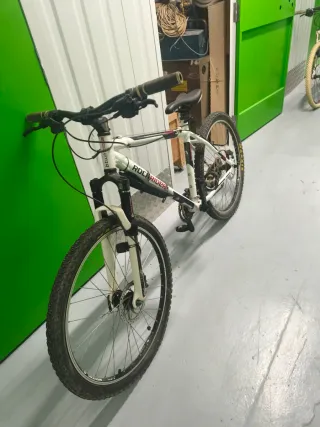 Bicicleta de montaña personalizada con detalles únicos. Luces delantera y trasera con intermitentes con mando ambas luces recargables cable tipo-C. Frenos hidráulicos con discos 160mm. Talla M ruedas 26 pulgadas. Tiene 8 marchas atrás y tres en el plato delantero con cambios SRAM. Con cubre radios rojos. Con una pequeña mochila roja. Con guardabarros trasero y delantero con efecto fibra de carbono. La bici está muy bien y funciona perfectamente. - Cuadro negro y blanco. - Llantas rojas. - Horquilla delantera blanca. - Manillar negro con puños rojos.