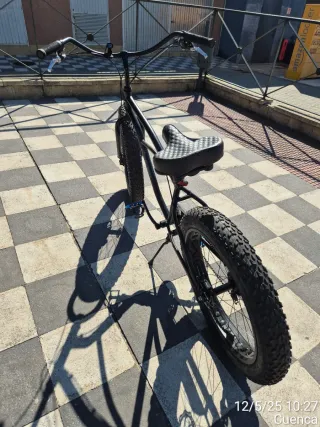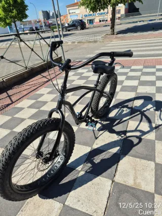 Bicicleta customizada con ruedas anchas (fat bike). Diseño único y llamativo. - Cuadro robusto. - Manillar curvo. - Sillín con diseño texturizado.