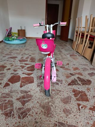 Bicicleta infantil de color rosa, ideal para los más pequeños. - Diseño divertido con dibujos. - Ruedines incluidos para mayor estabilidad. - Manillar con empuñaduras de goma.