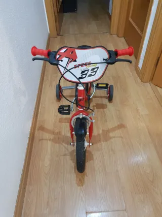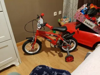 Bicicleta infantil de color rojo, ideal para los más pequeños. - Ruedines de apoyo incluidos. - Diseño deportivo con detalles en blanco y negro. - Manillar con puños rojos y placa decorativa.