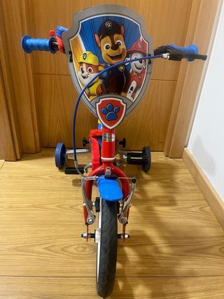 Bicicleta infantil de 12 pulgadas con diseño de la Patrulla Canina. Perfecta para cuando están aprendiendo. Regalo casco a juego. - Color principal rojo con detalles en azul. - Ruedines de apoyo incluidos. - Sillín y manillar con motivos del personaje. - Guardabarros delantero y trasero.