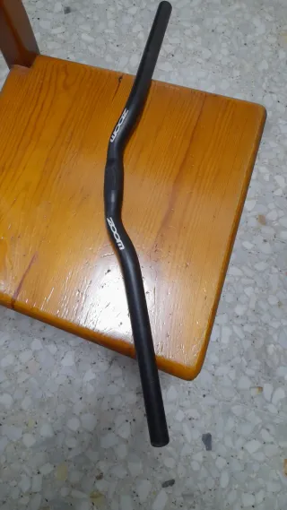 Manillar de moto o bici de color negro, con un diseño curvo y un refuerzo central metálico. - Acabado en negro mate. - Refuerzo central de metal. - Diseño ergonómico.