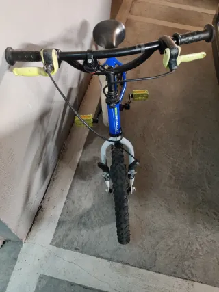 Bicicleta infantil de 16 pulgadas con diseño deportivo. - Color azul con detalles gráficos. - Ruedas de 16 pulgadas. - Manillar negro con puños. - Sillín negro.