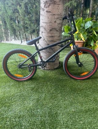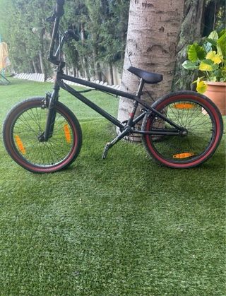 Bicicleta BMX de color negro con detalles en rojo. - Ruedas con aro rojo. - Reflectores naranjas en las ruedas. - Manillar de BMX. -Ruedas pinchadas