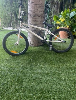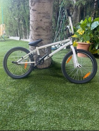 Bicicleta BMX de color blanco, ideal para disfrutar del ciclismo. - Cuadro resistente. - Ruedas de 20 pulgadas. - Manillar con puños negros. -Ruedas pinchadas