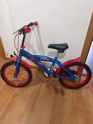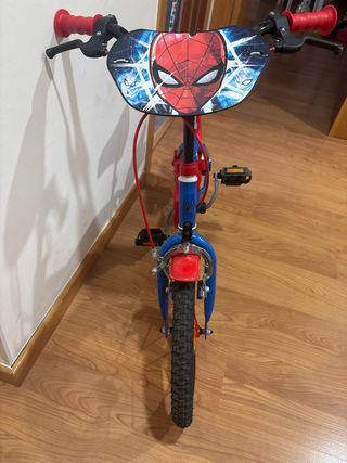Bicicleta infantil con temática de Spiderman, ideal para los más pequeños. - Ruedas de 16 pulgadas. - Diseño en color azul con detalles rojos. - Manillar y sillín ajustables.