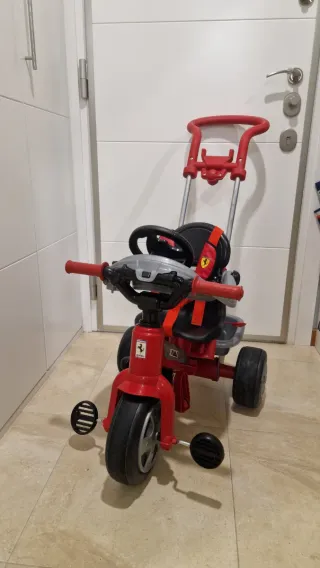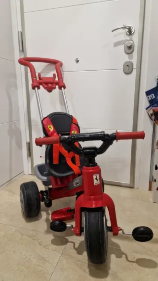 Triciclo infantil con diseño deportivo. - Color rojo Ferrari. - Asiento con arnés de seguridad. - Manillar para empujar. - Ruedas resistentes.