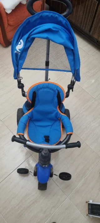 Triciclo infantil con capota protectora y asiento acolchado. - Color azul con detalles en naranja. - Capota con malla. - Asiento con arnés de seguridad. - Manillar con puños. - Reposapiés. - Ruedas negras.