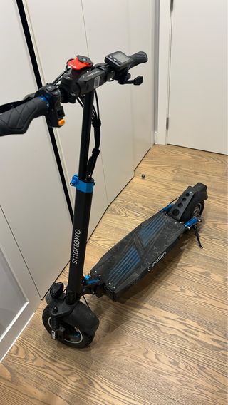 Patinete eléctrico Smartgyro en color negro con detalles en azul. Ideal para desplazamientos urbanos. - Diseño moderno. - Ruedas con buen agarre. - Manillar ajustable.