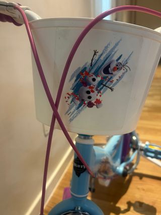 Bicicleta infantil con diseño de Frozen. Cuenta con un manillar decorado y una cesta frontal. - Diseño inspirado en la película Frozen. - Cesta delantera. - Manillar con puños rosas.