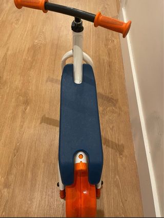 Bicicleta evolutiva para bebés de Decathlon. Ideal para los primeros desplazamientos. - Diseño en color azul y naranja. - Manillar con puños naranjas.