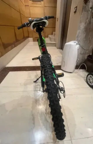 Bicicleta de montaña con un diseño llamativo en negro y verde. - Cuadro de bicicleta. - Ruedas de bicicleta. - Manillar de bicicleta. - Sillín de bicicleta. - Pedales de bicicleta.