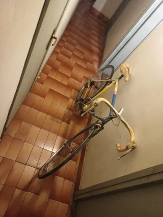Bicicleta de carretera BH Vento. - Cuadro de color blanco, azul y detalles en amarillo y rosa. - Sillín con diseño a rayas. - Manillar con cinta amarilla. Esta en un trastero hace mucho tiempo. Las cubiertas estan bien.