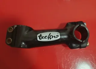 Potencia de manillar de la marca Techno. Pieza de ciclismo en color negro. - Largo potencia 100mm. - Para Horquillas 1 1/8. - Para Manillares 25.4mm. - Logo de la marca Techno visible. - Dos tornillos en la parte frontal. - Abrazadera para el manillar.