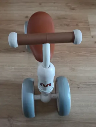 Bicicleta de equilibrio para niños pequeños, ideal para aprender a coordinar. - Asiento marrón. - Manillar con puños blancos. - Ruedas grises.