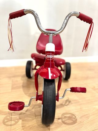 Triciclo Radio Flyer de color rojo, en excelente estado. Precio oficial 96€, lo dejamos por 50€. - Diseño clásico y resistente. - Asiento ergonómico. - Manillar con puños rojos y cintas decorativas.