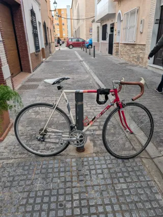 Bicicleta BH Vivace de carretera en buen estado. Ideal para rutas, paseos y para ciudad. - Cuadro de acero, pintura original en color blanco roto y detalles en rojo. - Cambio Shimano en cuadro, plato doble Campagnolo. - Manillar de carretera de aluminio. - Sillín cómodo tija de aluminio. - Marcas de uso, pero nada importante. - Llantas de aluminio. Estilo vintage, de los 80, muy resistente. Bici urbana, proyecto fixie, carreras.