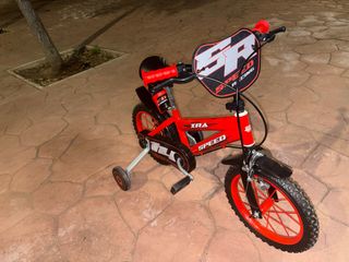 Bicicleta infantil de color rojo con detalles en negro y blanco. - Ruedines de apoyo incluidos. - Diseño deportivo SR Speed Racing. - Manillar con placa frontal. - Ruedas con llantas rojas.