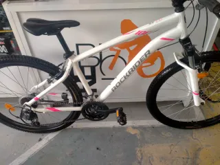 ROCKRIDER ST100 Talla: S Cuadro: Aluminio Transmisión: 3X7 Bielas: Rockrider Cadena: KMC Desviador: Btwin Cambio: Btwin Mando: Btwin Frenos: V-brake Pedales: Plástico Ruedas: 27.5" Rockrider Cubiertas: 27.5" Btwin Horquilla: Rockrider Potencia: Rockrider Manillar: Rockrider Puños: Rockrider Sillín: DDK Tija: Rockrider Somos tienda, nuestras bicicletas son revisadas y damos 1 año de garantía. REBICI Av. Portugal 1, Móstoles Tlf: 641104507 Horario: Lunes a viernes 10:00-14:00