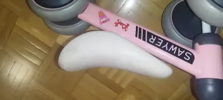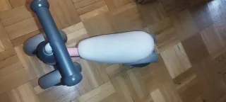 Bicicleta de equilibrio para niños pequeños, ideal para aprender a coordinar y mantener el equilibrio. - Color rosa con detalles plateados. - Asiento blanco acolchado. - Ruedas resistentes. Solo tiene una raja en la parte del manillar pero es estético no impide su utilizacion