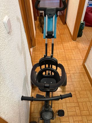 Triciclo infantil con asiento acolchado y cinturón de seguridad. - Estructura de metal y plástico. - Ruedas de goma. - Manillar de empuje para adultos. - Reposapiés.