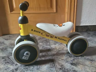 Mini bici de aprendizaje con diseño de pato B. Duck. De 10 a 24 meses. - Color amarillo vibrante. - Asiento blanco con diseño de pato. - Ruedas grises con detalles amarillos. - Manillar negro. - Decoración de patitos y texto BE PLAYFUL!.