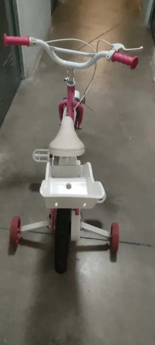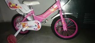 Bicicleta infantil de color rosa, ideal para los más pequeños. - Sillín y manillar ajustables. - Incluye ruedines para mayor estabilidad. - Diseño divertido con detalles de princesas lleva sillita muñeca. Esta pintada de rosa. Lleva protector de sillín.