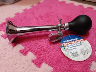 Bocina clásica de aire para bicicleta. - Material: Metal cromado y goma. - Incluye soporte para manillar.