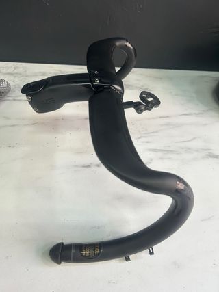 Manillar y potencia de la marca Enve. - Material: Carbono. - Diseño aerodinámico. Ancho manillar 37 Largo potencia 110 Incluye soporte garmin Anillas de altura incluidas