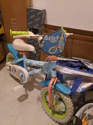 Bicicleta infantil con diseño de Bluey. - Color azul con detalles de nubes. - Ruedines incluidos. - Asiento y manillar ajustables.
