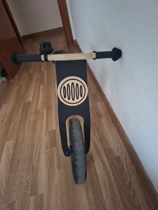 Bicicleta de equilibrio de madera de la marca Kinderkraft. Ideal para los primeros paseos. Está muy bien conservada, tal cual se ve en las imágenes. - Marco de madera natural. - Ruedas negras. - Sillín negro con logo en PERFECTO ESTADO. - Manillar de madera con puños negros y timbre.