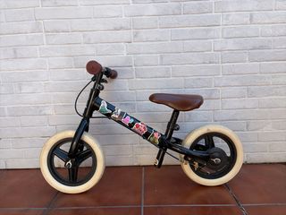 Bicicleta de equilibrio infantil en color negro del Decathlon. Perfecta para los primeros paseos y el aprendizaje. Se puede regular la altura de sillín y manillar. Tiene pegatinas que le puso mi hija pero se las puedes quitar fácilmente. Para edades de aprox 1 a 3 años
