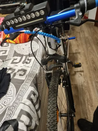 Bicicleta de montaña Rockrider con muy poco uso, solo 1 mes. - Modelo: Rockrider ST 100 - Color: Blanco y negro - Ruedas: 27.5 pulgadas - Frenos: Disco mecánicos - Cuadro: Aluminio Habría que cambiar la cámara de la rueda delantera por lo demás esta como nueva El foco y el extensor de manillar no está incluido ,la mochila y los posa pies si.