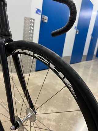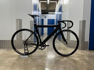 Bicicleta de pista de color negro, diseñada para velódromo. Talla M/54 yo mido 1’81cm y la postura es bastante agresiva - Cuadro de aluminio. - Ruedas Miche Pistard. - Manillar Deda pista - Bielas Sram