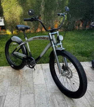 Bicicleta estilo chopper con un diseño vintage. - Cuadro negro con detalles de llamas. - Manillar alto y curvo. - Asiento negro. - Ruedas anchas. Ah estado guardado hay que hacerle detalles