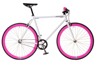 Bicicleta urbana Kamikaze con un diseño llamativo en blanco y detalles en rosa. - Cuadro de color blanco. - Ruedas con aro de color rosa. - Puños de manillar en color rosa. 53/56 Última dos unidades