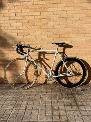 Bicicleta de adulto urbana tipo fixie, fixed talla 58, cadena nueva, cinta de manillar nueva confort, manillar tipo bullhornet, single speed (una velocidad), cubiertas y camaras nuevas, cables y cubrecables nuevos, piñon nuevo, pastillas nuevas, pedales nuevos, etc. Pintura en muy buen estado (sin oxido). Peso 9'5 Kg Lista para circular sin tener que reparar nada.