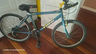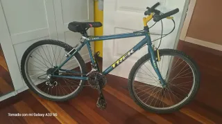 Bicicleta de montaña Trek de tamaño mediano. - Cuadro de color azul verdoso. - Llantas de 26 pulgadas. - Manillar amarillo. - Sillín negro con detalles rojos.