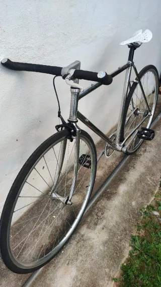 Bicicleta cromada de adulto urbana tipo fixie o fixed talla 54 cadena nueva, cinta de manillar nueva, manillar tipo bullhornet, single speed (una velocidad), rueda trasera flip-flop (dandole la vuelta pasas de piñon libre a piñon fijo), un freno (delantero), sillín nuevo de araña (muy cómodo), cubiertas y camaras nuevas. Lista para rodar sin tener que reparar nada.