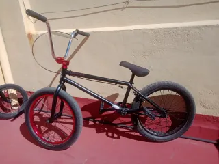 Bicicleta BMX de color negro con detalles rojos. Haro baseline talla 20'5 montada a capricho, freno Odyssey pro2 - Cuadro resistente. - Manillar cromado. - Ruedas con llantas roja y negra