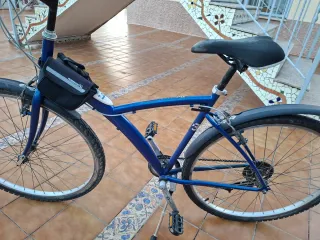 Bicicleta de paseo btwin de Decathlon con portacargas y soporte para móvil. - Portacargas trasero. - Soporte para móvil integrado en el manillar. Funciona y te llevará a todos lados, pero necesita puesta al punto porque la cadena está floja. No incluye candado o algún otro extra. Entrego por Alfahuir o Benimaclet.