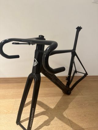 Cuadro de bicicleta Megamo Raise talla 54. Incluye: - Manillar integrado de carbono con soporte para Garmin. - Tija de carbono. - Sillín Selle San Marco Shortfit Dynamic Wide Manganese Carbon Fiber Reinforced 250 x 144mm. - Pedalier con rodamientos cerámicos.