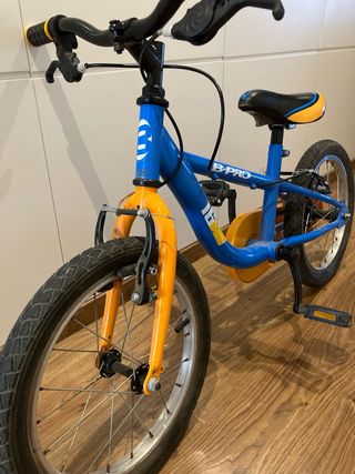 Bicicleta infantil de la marca B-PRO con ruedas de 16 pulgadas. Ideal para los más pequeños. - Color azul y naranja. - Manillar con puños de goma. - Sillín ajustable.