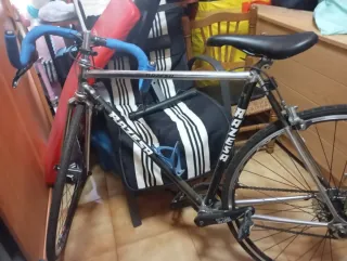 Bicicleta de carretera, ideal para quien busca piezas o necesita hacer reparaciones ojo no es nueva la vendo para reparar o para piezas si te interesa tienes que venir a población sueca a recogerla hago envíos por wallapop repito no es nueva ni está restaurada.. - Cuadro de bicicleta de carretera. - Manillar con cinta rosa. - Sillín negro.