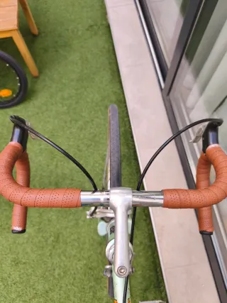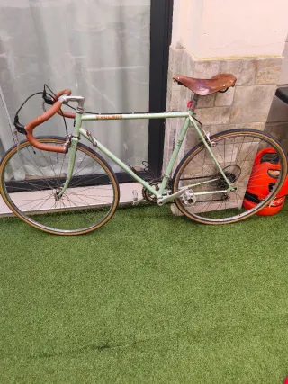 Bicicleta de carretera clásica Peugeot en color verde menta. Un modelo vintage con un diseño atemporal. - Cuadro de acero. - Sillín de cuero marrón. - Manillar curvo con cinta marrón. - Ruedas de radios. -No hay que hacerle nada lista para rodar -Ruedas Michelin muy rápida y ligera - Sillín broks de cuero - Funciona todo correcto marchas frenos
