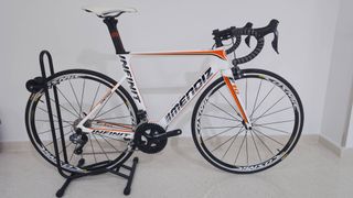 Bicicleta de carretera Mendiz F10 en color blanco y naranja. - Cuadro y horquilla de carbono. - Ruedas Mavic Cosmic. - Transmisión Shimano Ultegra electronico - Manillar y potencia aluminio - Tija Fact Carbon