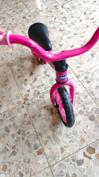 Bicicleta de aprendizaje sin pedales de la marca Chicco.Esta con dos usos. Tiene un rallazo en el manillar de esta guardada. - Color rosa vibrante. - Diseño Pink Arrow.