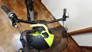Bicicleta urbana con cesta delantera y casco incluido. - Manillar con puños negros. - Timbre plateado. - Cesta de malla negra. - Casco de ciclismo negro y amarillo fluorescente.