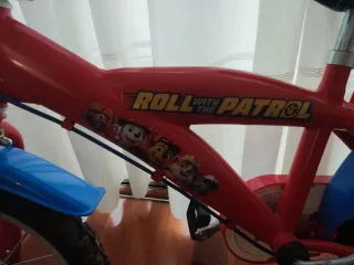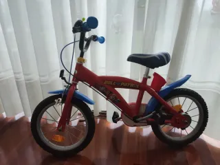 Bicicleta infantil con diseño de la Patrulla Canina. - Color principal rojo con detalles en azul. - Ruedines de apoyo incluidos. - Manillar con puños azules y timbre. - Sillín azul y negro. - Guardabarros delantero y trasero.